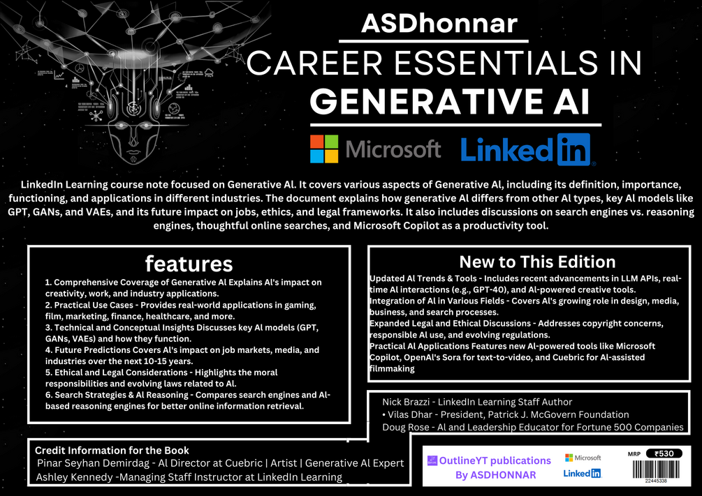 LinkedIn Learning course note focused on Generative Al. It covers various aspects of Generative Al, including its definition, importance, functioning, and applications in different industries. The document explains how generative Al differs from other Al types, key Al models like GPT, GANs, and VAEs, and its future impact on jobs, ethics, and legal frameworks. It also includes discussions on search engines vs. reasoning engines, thoughtful online searches, and Microsoft Copilot as a productivity tool.